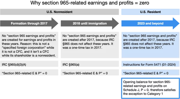Now look at the filing exception: the Category 1 filing requirement continues until section 965-related earnings and profits on Schedule J (and Schedule P) are zero. Which they are, on the first day of U.S. residency.
