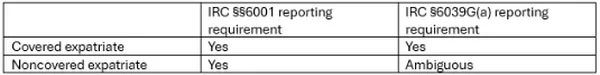 - Therefore, IRC §877A does not “apply” to noncovered expatriates, and in turn the reporting requirement of IRC §6039G(a) is not triggered.