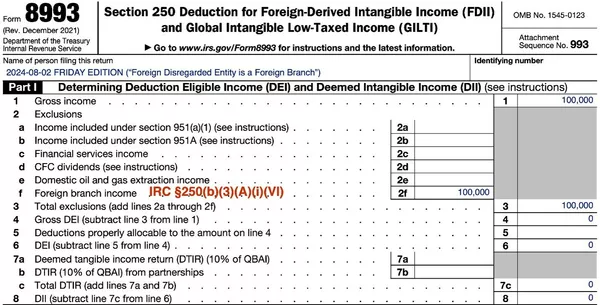 - Because the foreign disregarded entity’s income is “foreign branch income” and the way the math is set up (see Form 8993, line 2f) means that the income base to compute foreign-derived intangible income is zero.