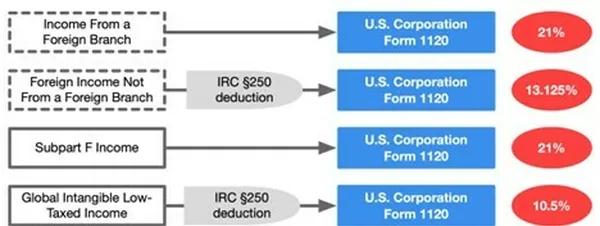 Depending on the structure choice (CFC or foreign disregarded entity) and the income type, a dollar of profit from foreign business operations might be taxed at 10.5%, 13.125%, or 21%.